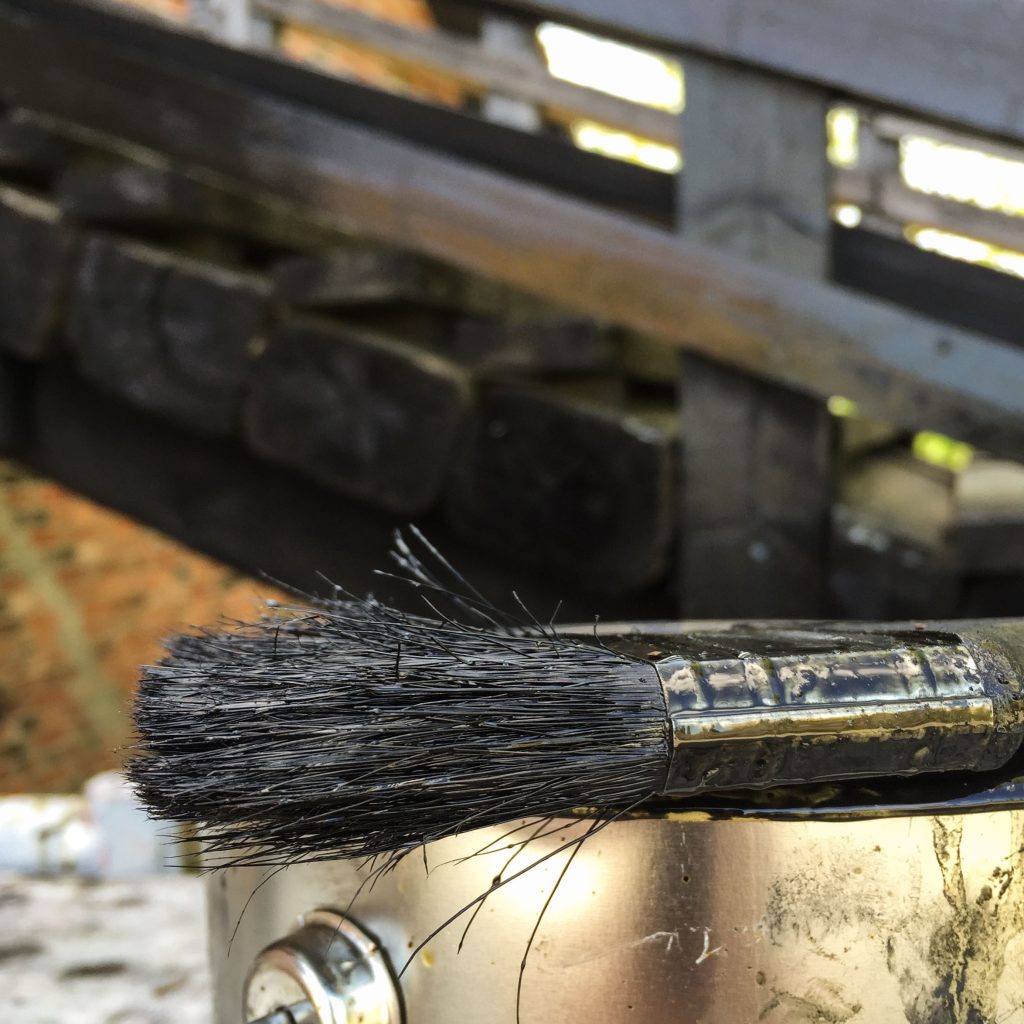 Perinteinen tervapensseli on nelikulmainen tervasuti mutta maalauksen voi myös suorittaa tavallisella sianharjas siveltimellä. Perinteinen käsien puhdistusaine tervauksessa on ollut todellakin voi. Rasva irrottaa tervan, mutta pellavaöljysaippua on vielä tehokkaampaa ja tuntuu ehkä luontevammalta. Hiero käsiin nestemäistä pellavaöljysaippuaa ja huuhtele, samalla tavalla voit myös puhdistaa siveltimet. Käytä lisäksi kiehuvaa vettä johon voit kastaa siveltimet pellavaöljysaippualla vaahdottuina. Näin niistä tulee kuin uudet. Tervan tuoksuista kesää!