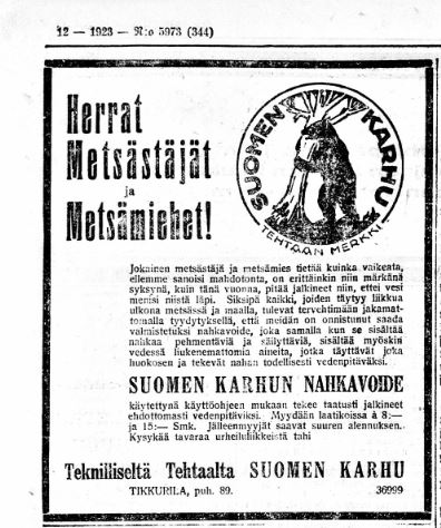 Märkä talvi vaatii nahkaisilta käyttötavaroilta paljon hoitoa. Vesi menee läpi ja kovettaa nahkaa sekä rikkoo saumoja ja ompeleita. Kiinnostavaa mainoksessa on että se on kohdistettu miehille, metsämiehille. Karhu on varmasti meille kaikille tutumpi suksimerkkinä ja voidemerkki kuin pelkkä nahanhoitoaine. Tässä kuitenkin luvataan että hoitoaine on kehittyneempi kuin muilla koska siinä on ainesosia jotka eivät liukene veteen. Ollaanko jo lähellä coretex tuotteita – itse käsiteltyinä. Nahan hoito on aina perustunut rasvaan ja sen määrään voiteessa. Lisäksi kiillottaminen koventaa pintaa ja lisää hylkivyyttä.