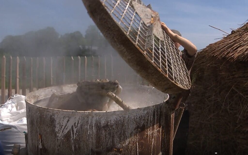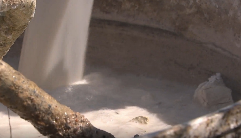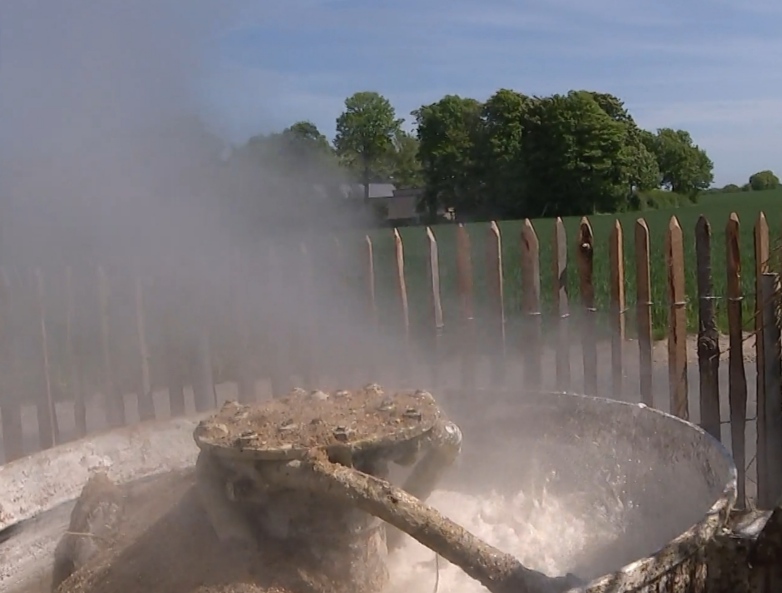Kalkkitahnaksi poksahtaneet kivet ovat siis kuumia ja kun vesi ja kalkki yhtyy alkaa vesi kiehua ja höyrystyä. Veden kuumeneminen rikkoo kivet ja ne poksahtaen hajoavat pieneksi ja rumpu hiertää ne veden kanssa rakeaksi tahnaksi jota täytyy siivilöidä. Siitä erotetaan kivimurut sekä karkeudet hienosiivilässä käsi menetelmin.