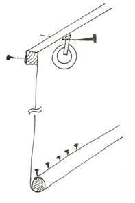 - Poraa valmiiksi reiät ylärimaan kiinnityskohtiin ja kiinnitä verho taotuilla nauloilla tai ruuveilla (huomio että kannan tulee peittää reikä siististi). Älä unohda kiinnittää samalla naruja lenkeistään. Katso kuva 1.