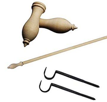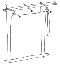 Verhokangasta, käsin taottuja nauloja tai ruuveja, nupinauloja tai niittejä, pumpulinarua(10m), 2 suupuhallettua lasirengasta, 2 nahka remmiä, rimaa (12mmx22mm) ja pyörötankoa: halkaisija 27mm pituus 150cm tai ikkunan mukainen. Mahdollisesti voit käyttää seinäkiinnikkettä säätönarulle.